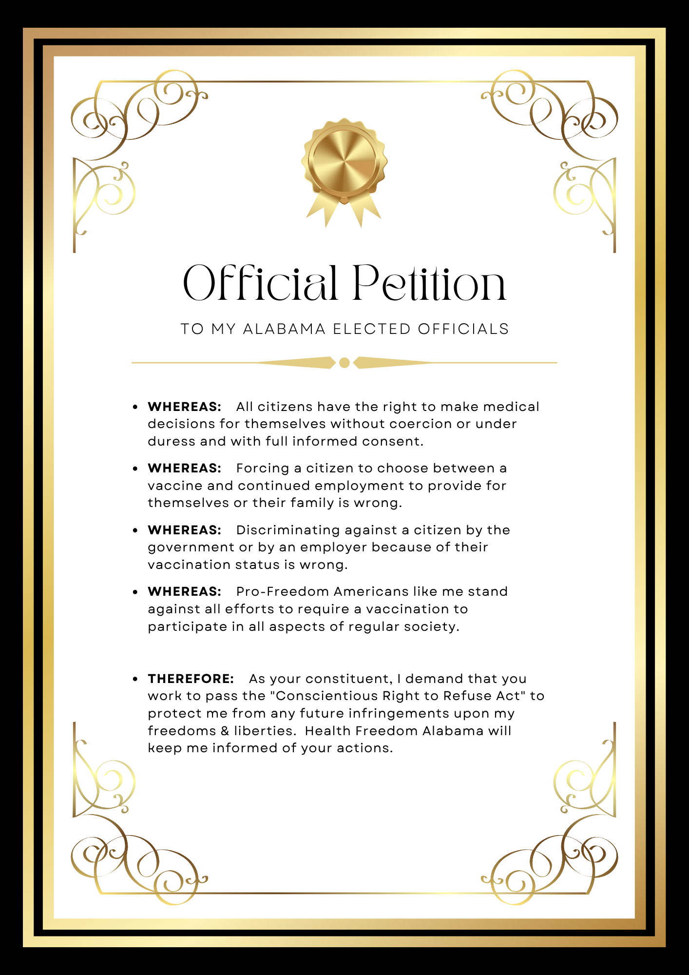 Your signature on this petition can help Health Freedom Alabama fight back!